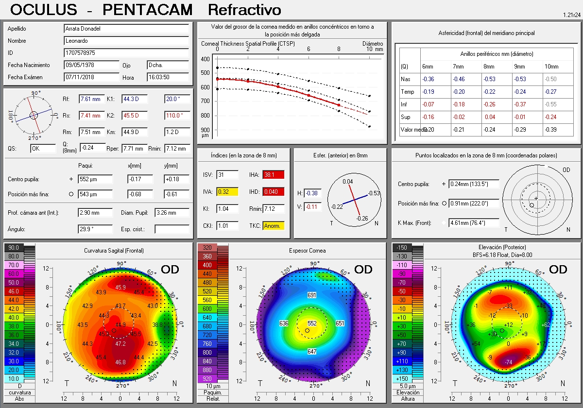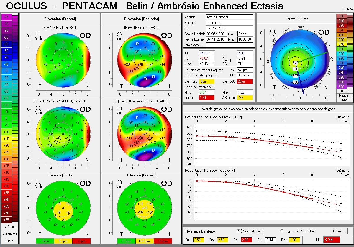Queratocono: OCT de cónera, mapa epitelial, paquimetría y pentacam